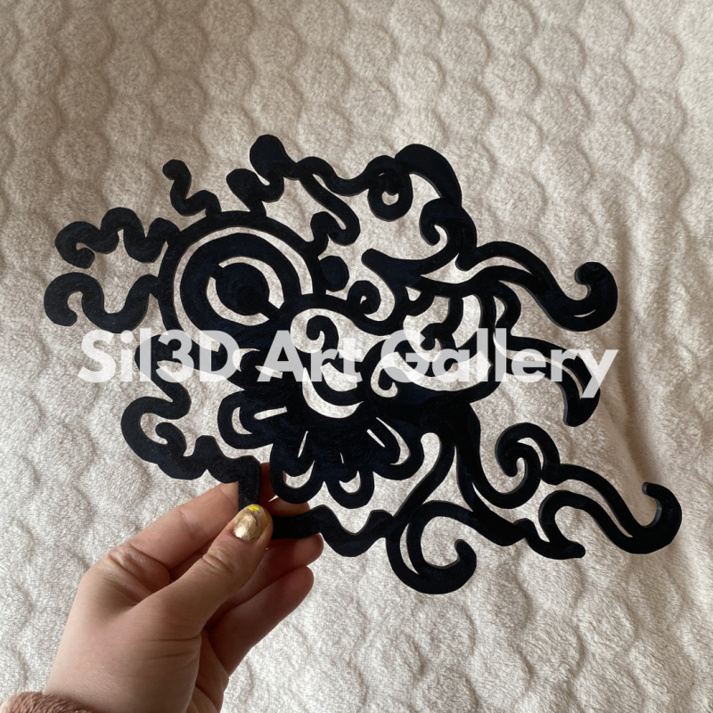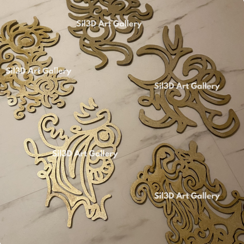 I have a full collection of six patterns and their names: 1. SUNSET, 2. AMOUR, 3. CANARI, 4. PYTHON, 5. SUMMER and 6. GERBERA. Ofcourse, I name them after what I think they look like. The non painted colour of this ASA filament is black but I make them metallic gold.