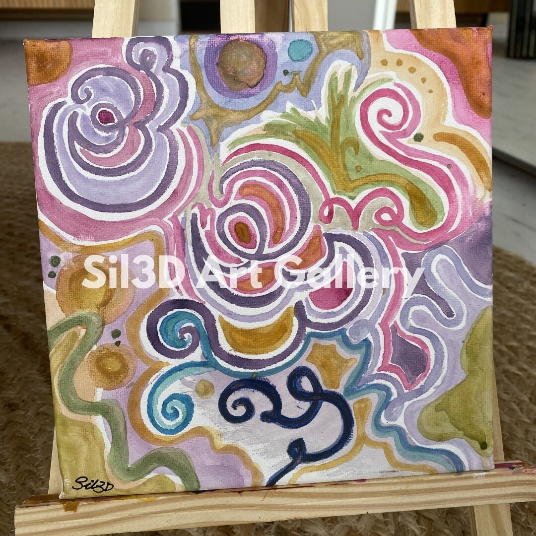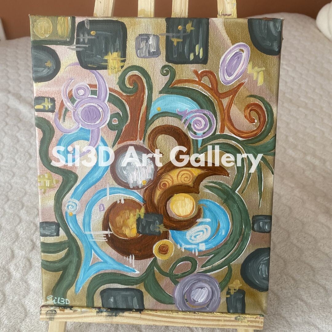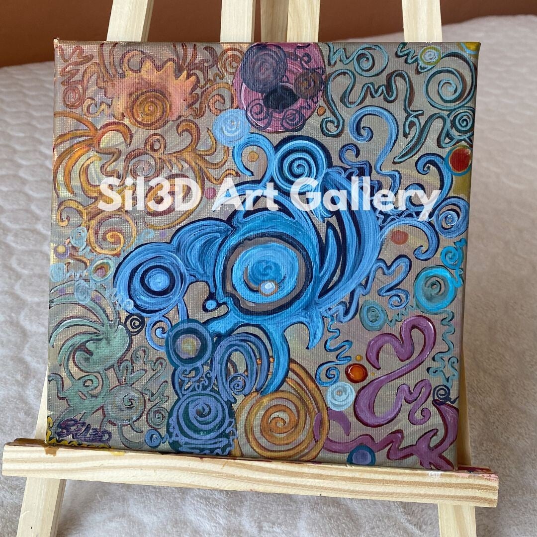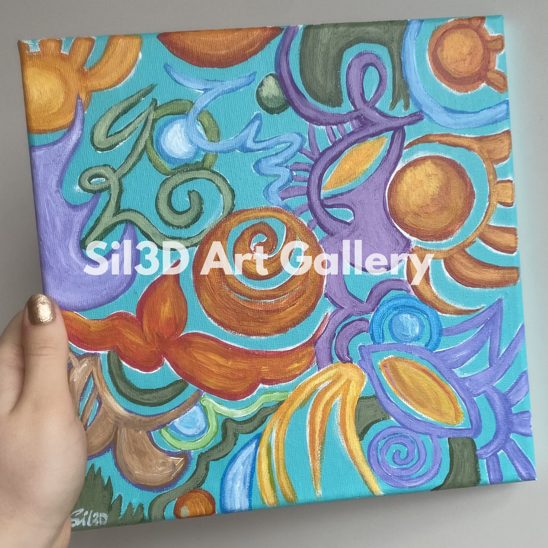 After the background is dry, I paint over it with white acrylic paint. This is the most free part of painting for me because here I just draw what I feel like, which are the organic, elegant shapes. Then after that I color it and add more shapes, which takes the most time. I find that the dark boxed shapes that I added give the painting a hint of surrealism.