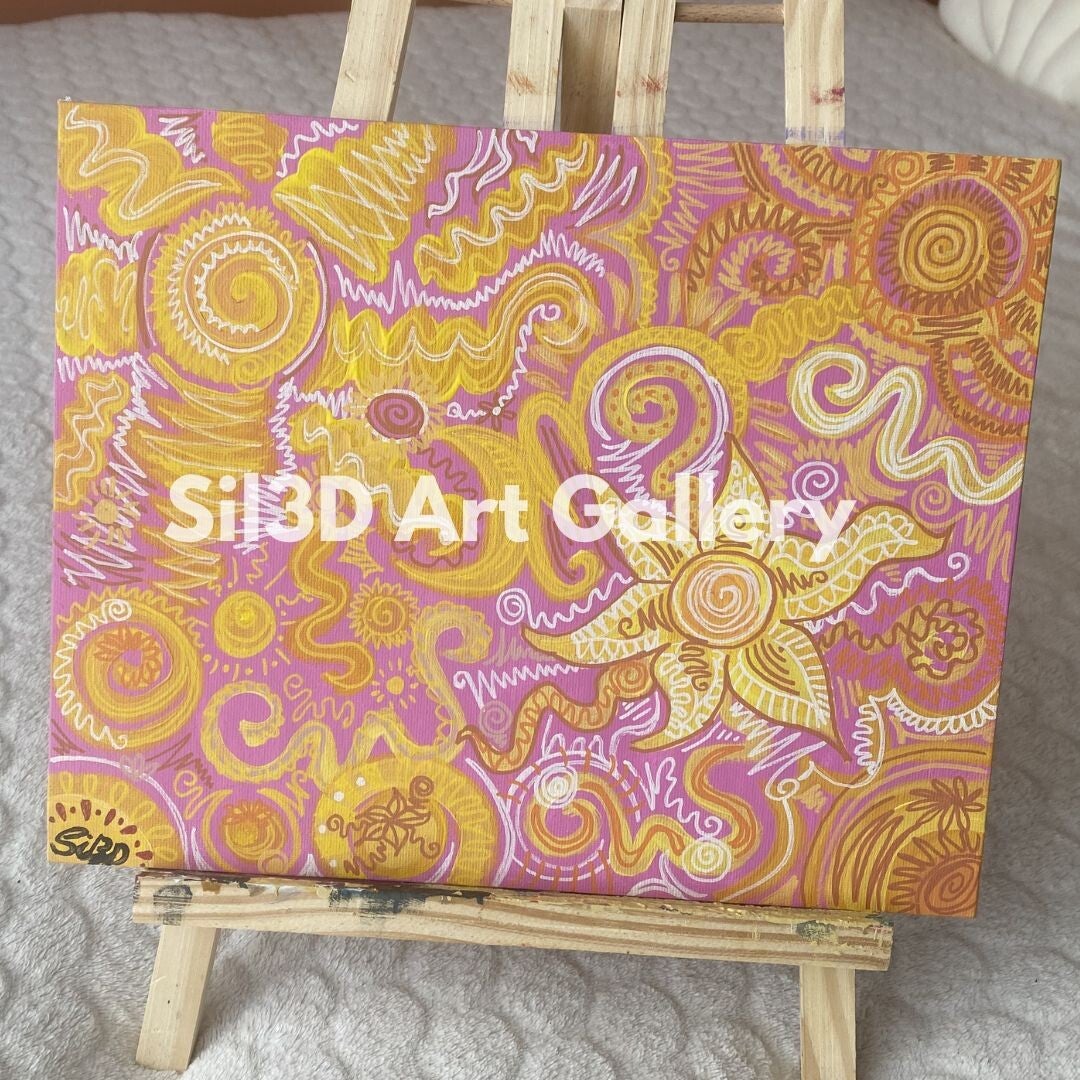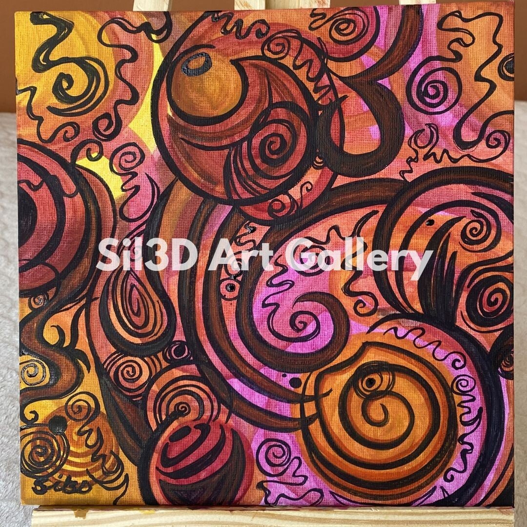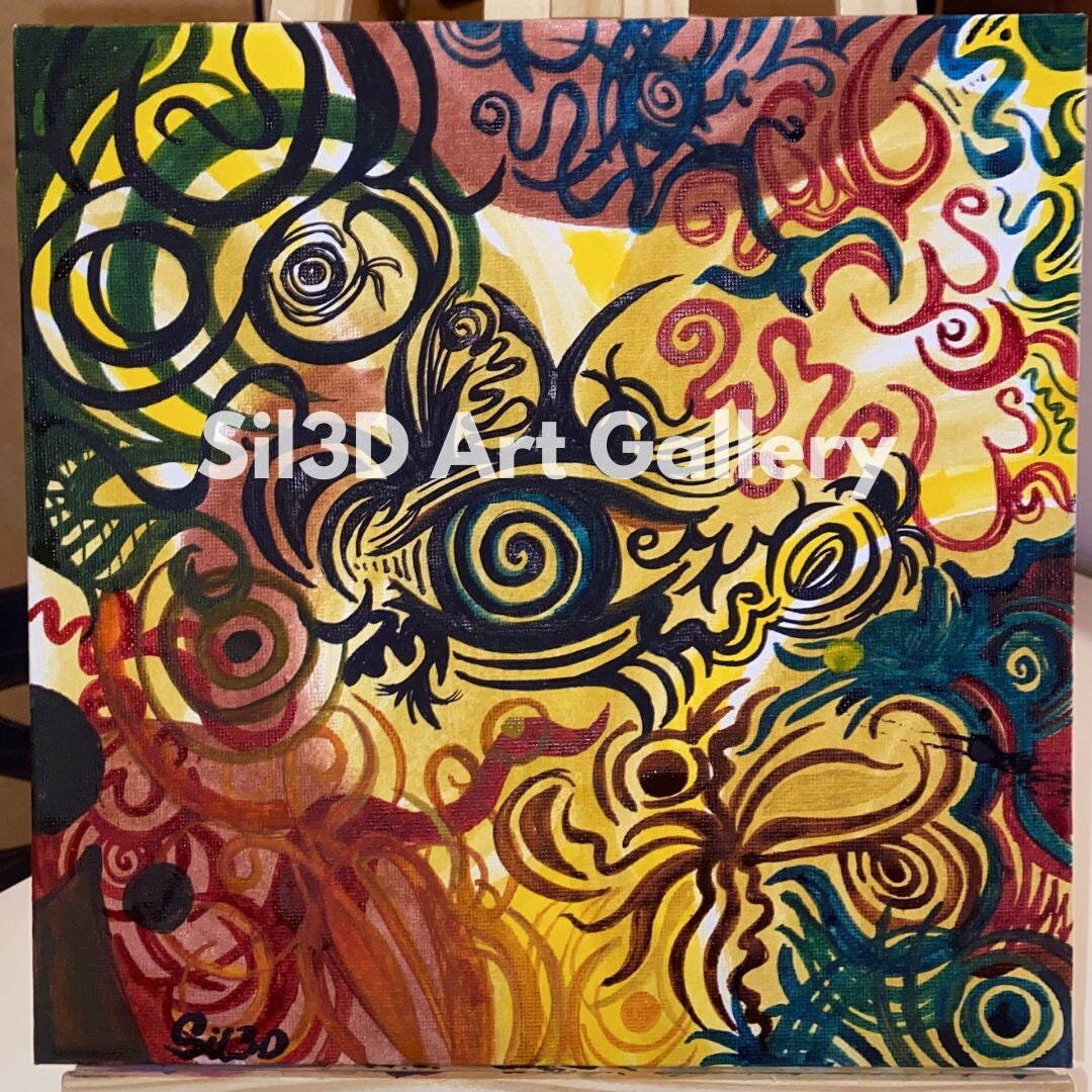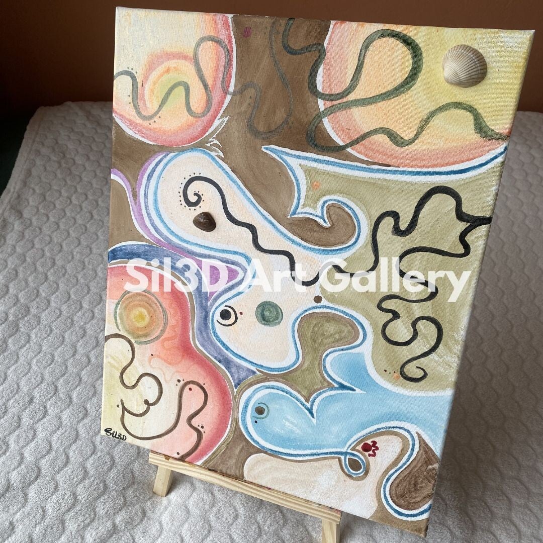 After the background is dry, I paint over it with white acrylic paint. This is the most free part of painting for me because here I just draw what I feel like, which are the organic, elegant shapes. Then after that I color it and add more shapes, which takes the most time. I find that the dark boxed shapes that I added give the painting a hint of surrealism.