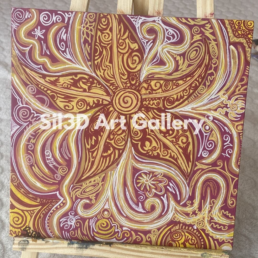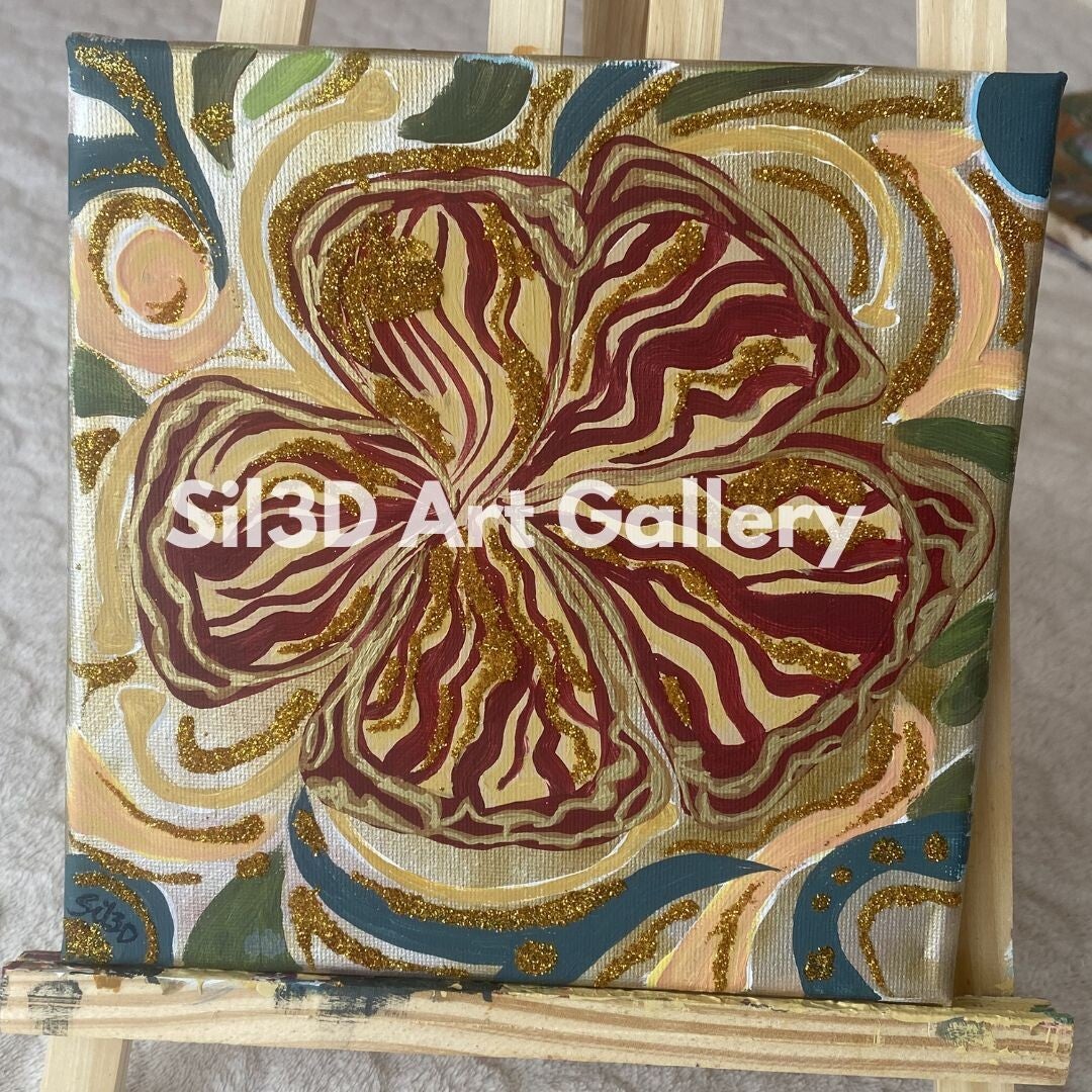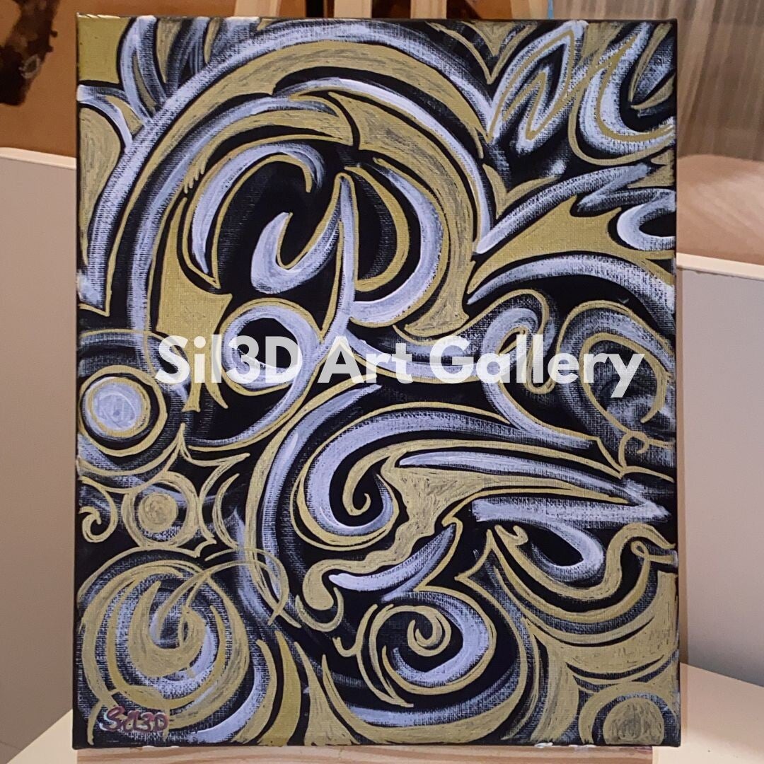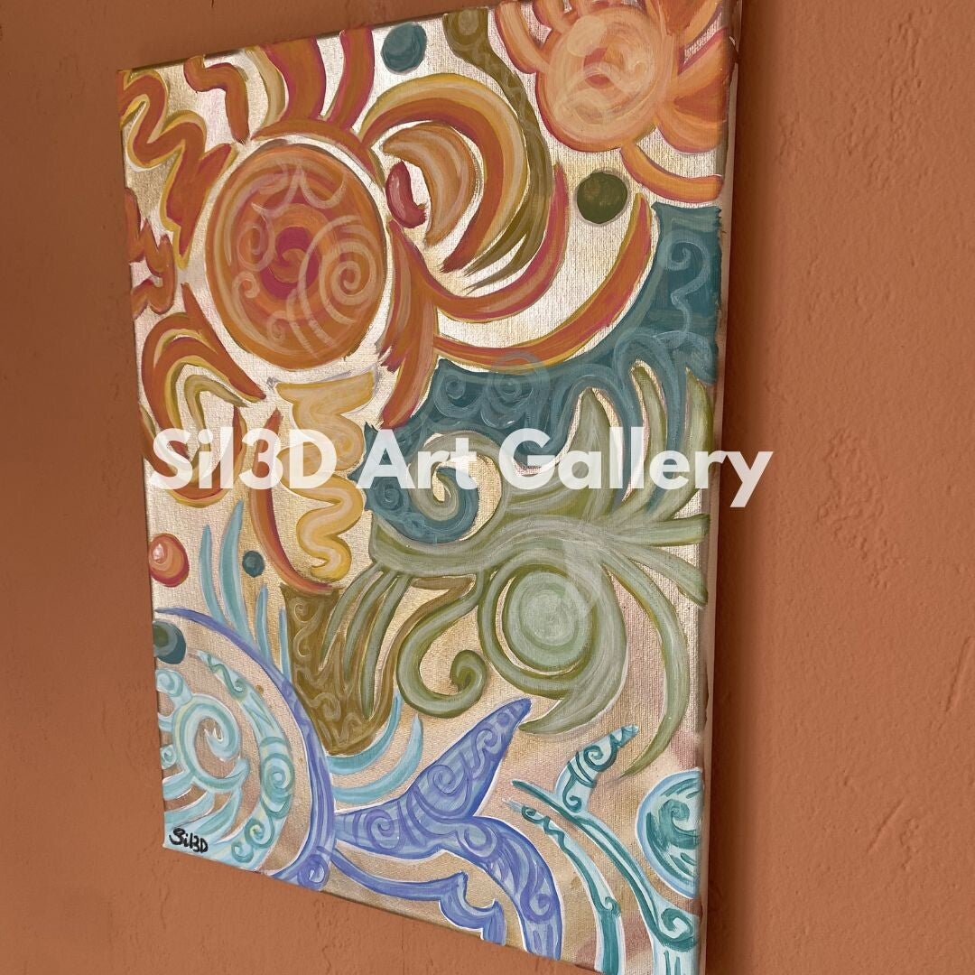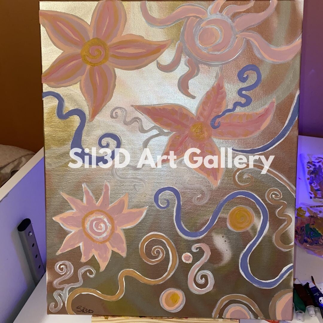 The background is something that I once tried and now is my signature thing. This background exists out of three metallic colours; champagne, gold and rose gold. I spray painted it in a nice pattern. The result gives a dreamy shiny canvas. If you walk past the painting you can see it reflect light and because of the patterns and different colours, every other angle looks different. That is what I like, you don't know where to look. Especially with the acrylic painted objects over it that don't reflect light makes it even more mystical.